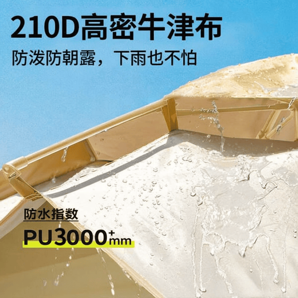 这款帐篷配备了一键速开的功能,让你在周末露营时不但可以迅速搭建,还能节省更多时间投入到与家人朋友的欢聚中。228×228CM的空间设计,可轻松容纳4人安稳休息,甚至6人围坐小聚,宽敞不拥挤。双层银胶材质提供极其出色的防晒效果,99%的紫外线都能被有效阻挡,让你在户外活动中倍感凉爽舒适。同时,它的高密度牛津布面料具备优秀的防水性能,无论是突如其来的小雨,还是泥泞的草地,都能从容应对,让你安心度过每一个夜晚。