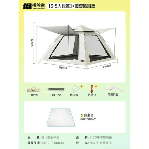 宽敞的内部空间设计和加高的帐篷顶,让这款帐篷在舒适度上毫不妥协。可以轻松容纳3-5人的使用需求,适合家庭或者好友聚会,在帐篷中围坐、聊天,不再感到拥挤。强化的纤维支架增加了帐篷的稳固性,可承受5-6级的大风,确保你在多变的户外环境中也能保持安全。结合这些优点,这款帐篷无疑是每个户外探险者的必备良品,助你尽情享受户外生活的惬意与乐趣。