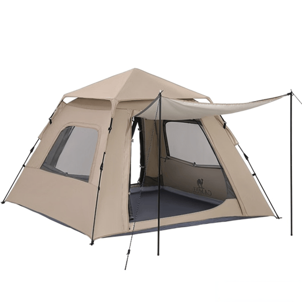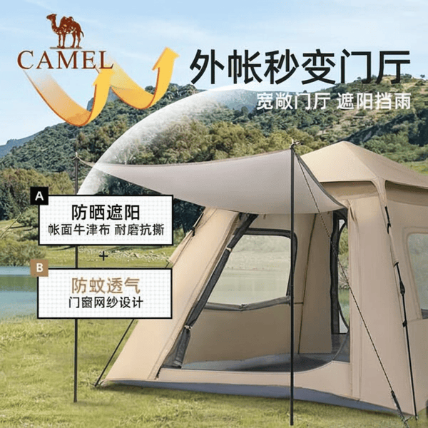 这款骆驼户外帐篷采用全自动设计,轻松一拉即可迅速展开,让你无论是在营地搭建还是途中休息,都能轻松应对,节约时机和精力。它的大空间结构设计很适合家庭使用,容纳多人活动却不会显得拥挤,很适合露营时和家人朋友聚在一起聊天、吃饭或玩游戏。帐篷采用多重科技材料,不仅有防晒涂银面料阻挡紫外线D牛津布的防水设计,完美应对各种天气状况,确保你在野外也能享受舒适的环境。