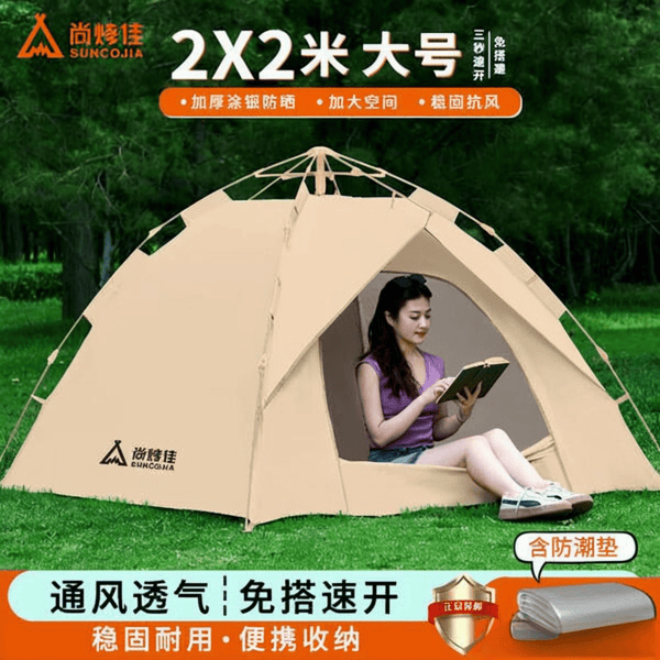 尚烤佳帐篷是一款专为户外活动设计的全自动帐篷,特有的弹压支架设计让搭建变得轻松无比,只需轻轻提起帐杆,即可快速展开。这种自动速开设计极大地方便了户外旅行者,尤其是当你急于找个遮蔽之处时,传统的搭建方式往往需要耗费大量时间和精力,而这款帐篷让你可以迅速享受到舒适的空间。