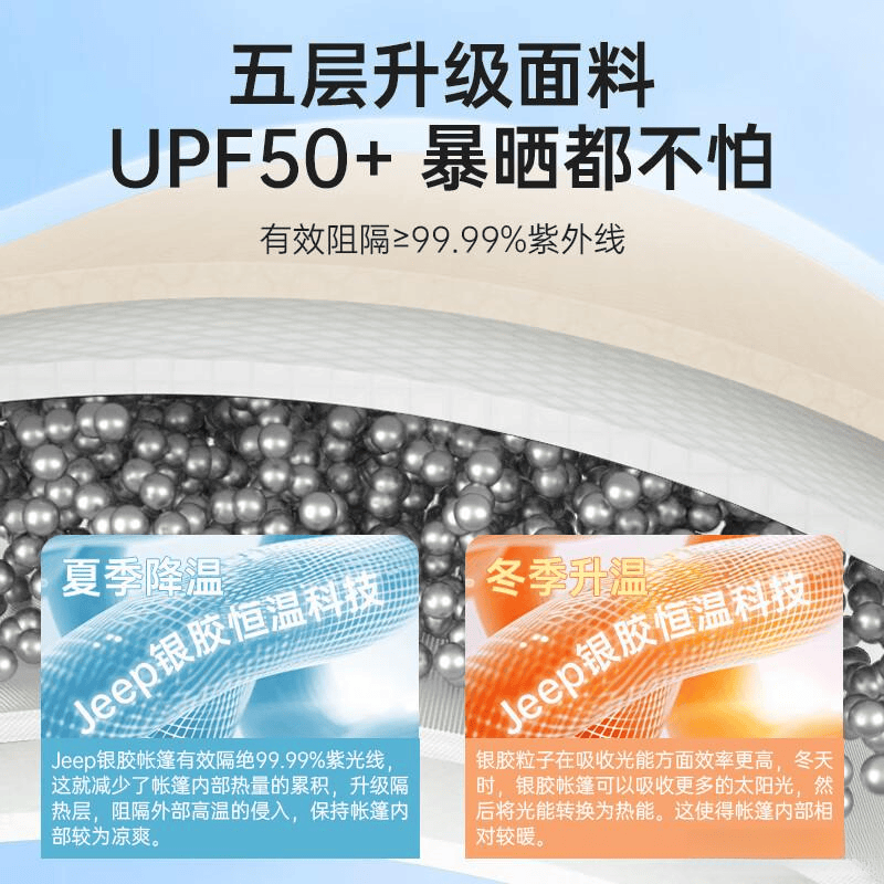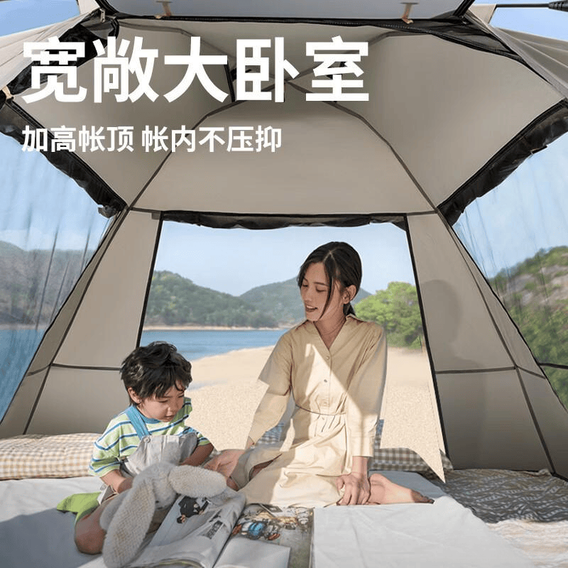 帐篷使用加厚涂银牛津布,具备卓越的防晒与防风性能。即使在烈日下,依然能够保持良好的舒适氛围,确保您和家人享受无忧无虑的户外时光。同时,宽敞的4.4㎡空间设计,使2个成人和2个孩子都能在里面自由活动,再也用不着担心拥挤的问题。