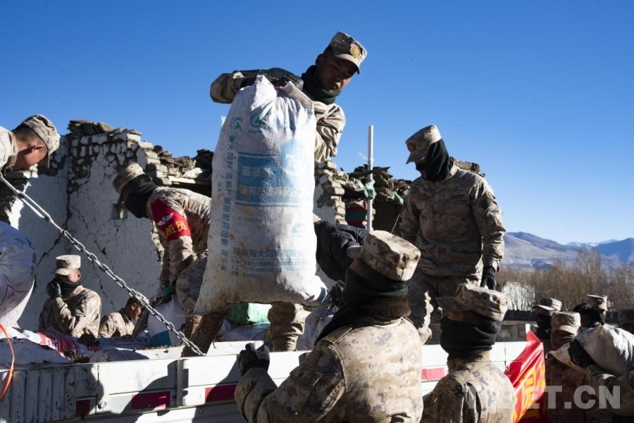 图为在定日县长所乡嘎旦村官兵正在帮助受灾群众搬运社会各界所捐赠的物资(摄于2025年1月8日) 摄影:赵振宇
