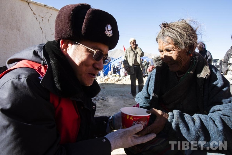 图为在定日县曲洛乡措昂村受灾安置点,刚刚换岗的公安民警将自己手中的早饭送到受灾群众的手中(摄于2025年1月9日) 摄影:赵振宇