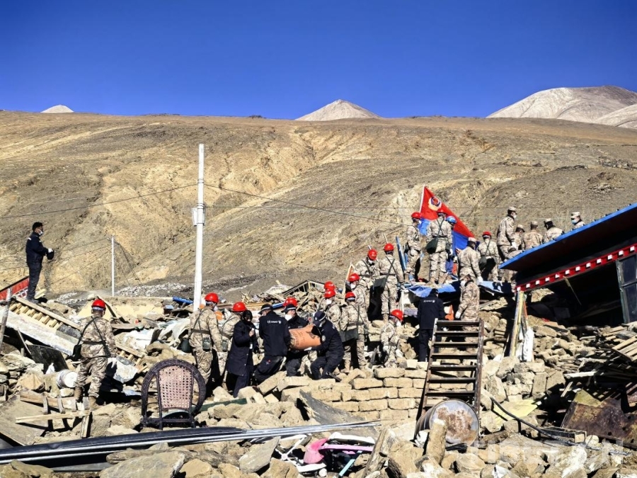 大地撕裂的瞬间,定日的山川记住了疼痛。这些影像定格了灾难降临时的原始模样——倒塌的房屋、扬起的尘土、撕裂的大地。但在满目疮痍中,更震撼的是那些逆行身影:人民子弟兵、消防救援队伍、移民管理警察、公安干警与当地干部在废墟上的紧急救援,一双双沾满泥土的手在瓦砾中寻找生命的迹象。灾难过后,是无数人日夜兼程奔赴的开始。