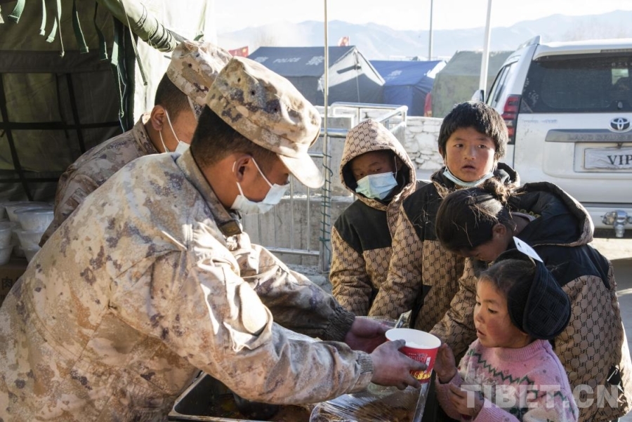 图为在定日县长所乡古荣村安置点内,官兵为受灾群众提供一日三餐(摄于2025年1月11日) 摄影:赵振宇