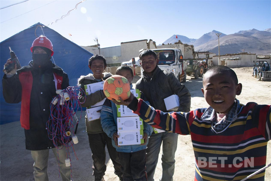 图为地震发生第三日,在定日县曲洛乡措昂村国家电网工作人员为受灾群众安置点通电,孩子们开心地加入工作人员的队伍中随时搭把手(摄于2025年1月9日) 摄影:赵振宇