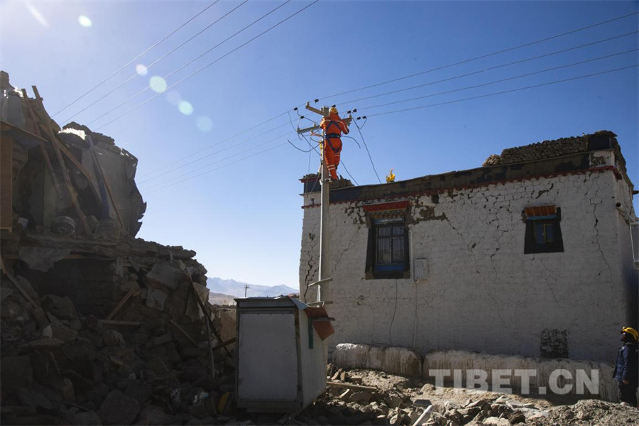 图为地震发生第三日,在定日县长所乡森嘎村国家电网工作人员为受灾群众安置点恢复电力供应(摄于2025年1月9日) 摄影:赵振宇