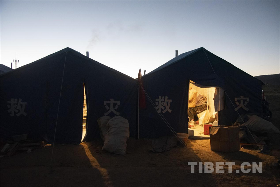 图为地震发生第四日,夜幕即将降临之时定日县长所乡杂村受灾群众安置点内救灾帐篷中泛起暖光(摄于2025年1月10日) 摄影:赵振宇