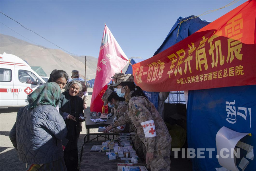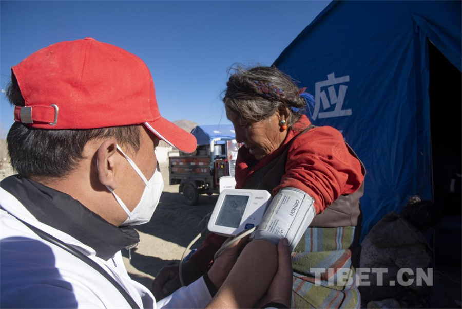 图为在定日县受灾群众安置点,作为第一支挺进灾区的民间医疗力量,西藏阜康医院的医生正在为受灾群众检查身体(摄于2025年1月14日)摄影:赵振宇