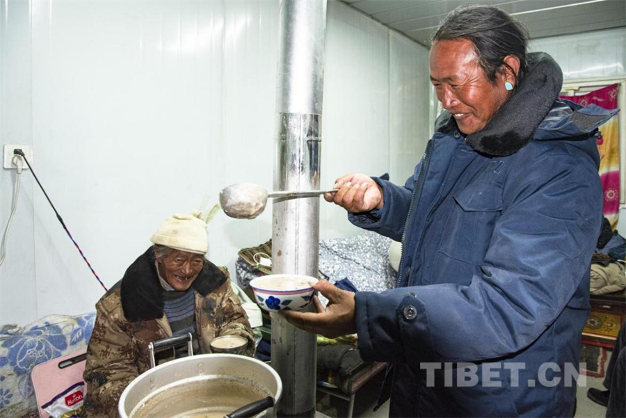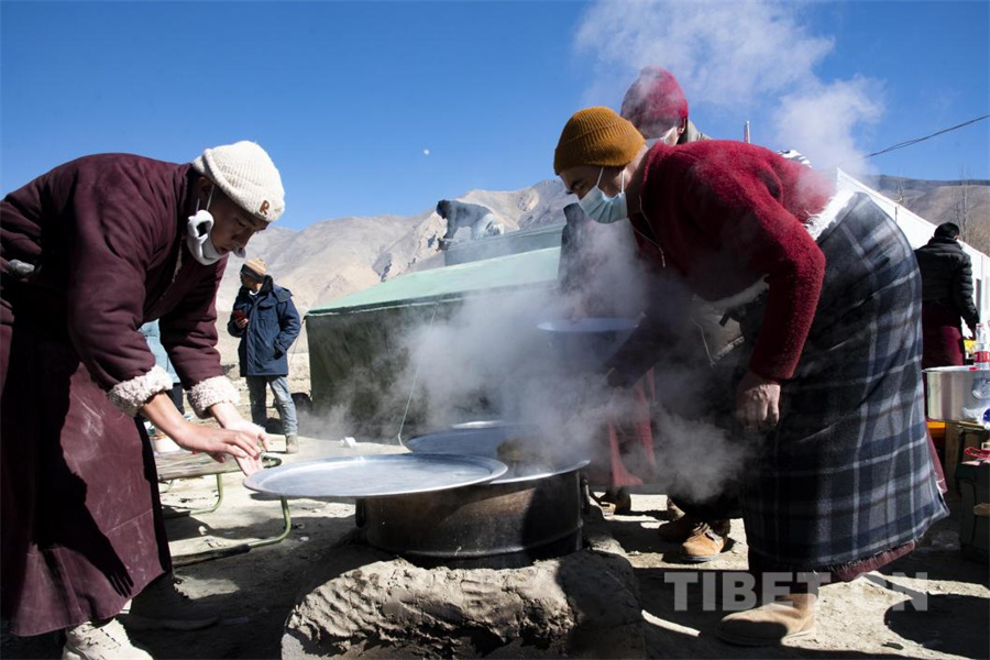 图为震后第一个藏历新年古突夜,在定日县长所乡茶江村受灾群众安置点里,村民扎西正在盛出热气腾腾的“古突”(摄于2025年2月27日) 摄影:赵振宇