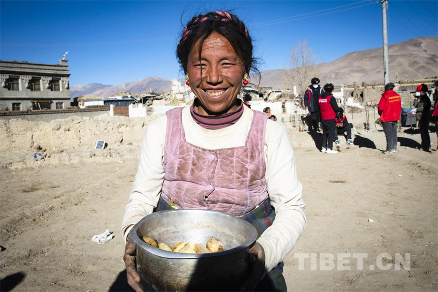 图为在定日县受灾群众安置点,受灾群众拿出家中煮熟的最好的土豆给每一位“客人”分发(摄于2025年1月14日) 摄影:赵振宇