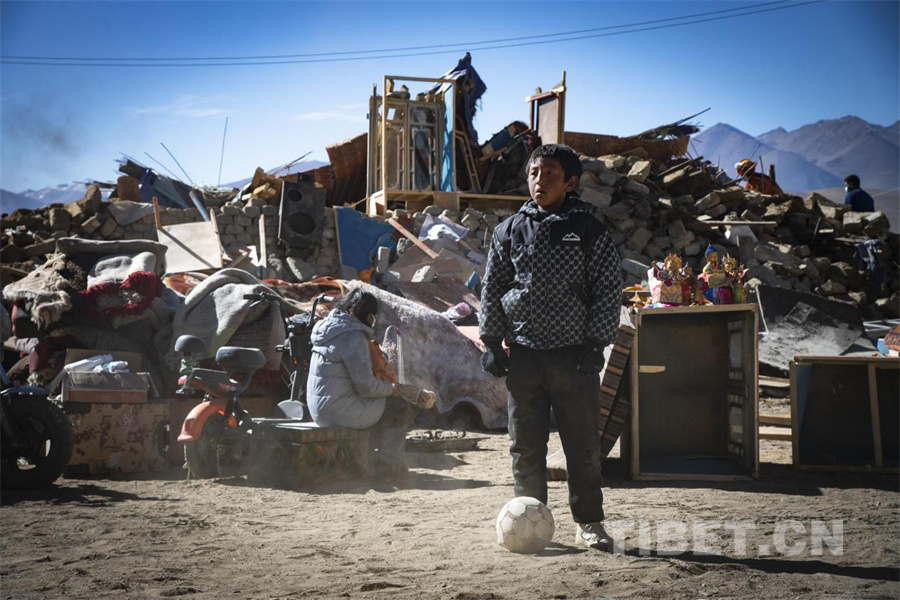 图为在定日县长所乡古荣村,一名小男孩在自家废墟前的空地上踢起足球,他们说足球能够让他们忘记失去家园的伤痛,能给我们自己所带来力量。(摄于2025年1月10日) 摄影:赵振宇