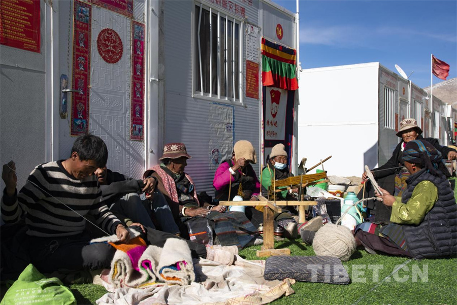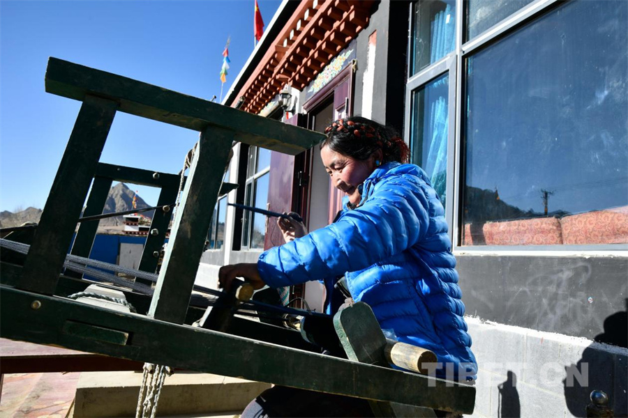 图为定日县协格尔镇奶色姆村的次仁拉宗在新居前笑容灿烂地纺织毛线日)摄影:赵振宇