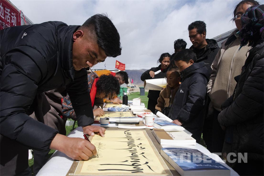 图为藏历新年之际,定结县邀请日喀则市文联书法家为受灾群众送上藏历新年祝福(摄于2025年3月1日)摄影:赵振宇