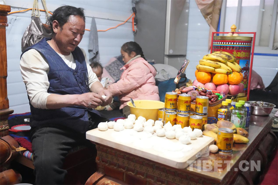 图为震后的第一个节日“日喀则农事新年”。这一天恰逢日喀则农事新年古突夜与农历春节除夕相遇在同一日。在定日县曲洛乡措昂村安置点内,拉华一家正在包藏式饺子庆祝这一天(摄于2025年1月28日) 摄影:旦曲