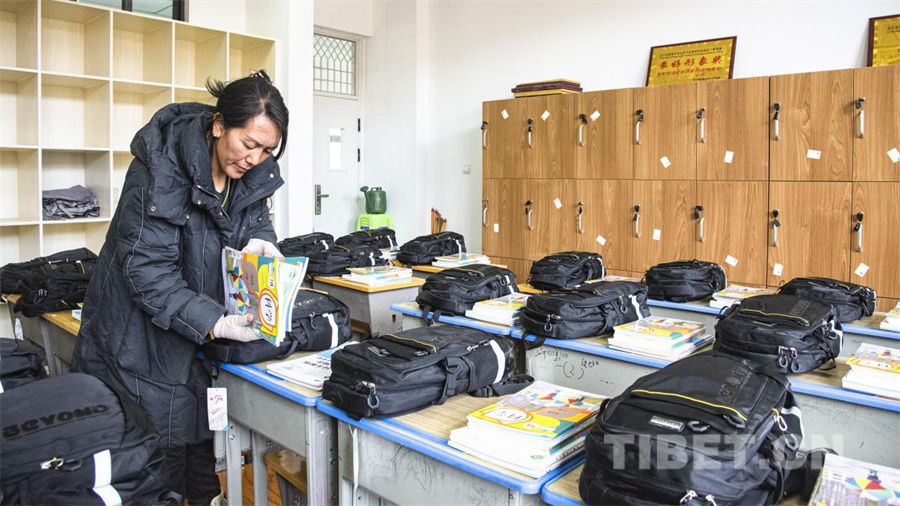 图为日喀则市定日县受地震影响的灾区学校即将迎来2025年春季学期正式开学,老师正在为即将到校的学生分发教材与学习用具。(摄于2025年3月1日) 摄影:赵振宇
