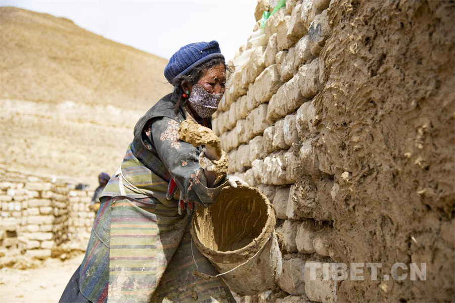 图为定日县曲洛乡嘎白村的村民正在用中国乡村发展基金会的10万元资金修建畜圈。修建所需的材料都来自于受灾村民自己坍塌的老房子的土砖,全村31户村民每户派出一名人员参与畜圈建设,每天会获得150元的务工报酬(摄于2025年2月27日) 摄影:赵振宇