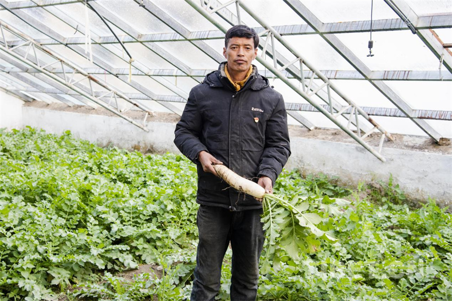 图为定日县长所乡嘎旦村村委会主任顿珠在震后修缮的蔬菜温室大棚内为记者展示棚内种植出的白萝卜(摄于2025年4月30日) 摄影:赵振宇