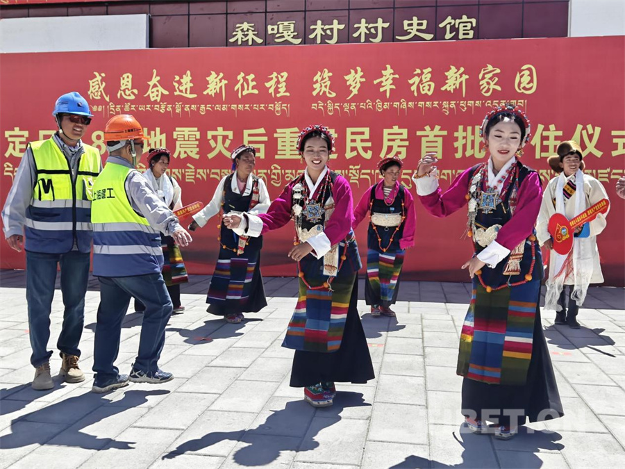 图为西藏定日6.8级地震灾后重建民房首批入住仪式现场,当地群众与施工队员载歌载舞,欢庆乔迁新居 (摄于2025年8月15日)摄影:次旦拉姆