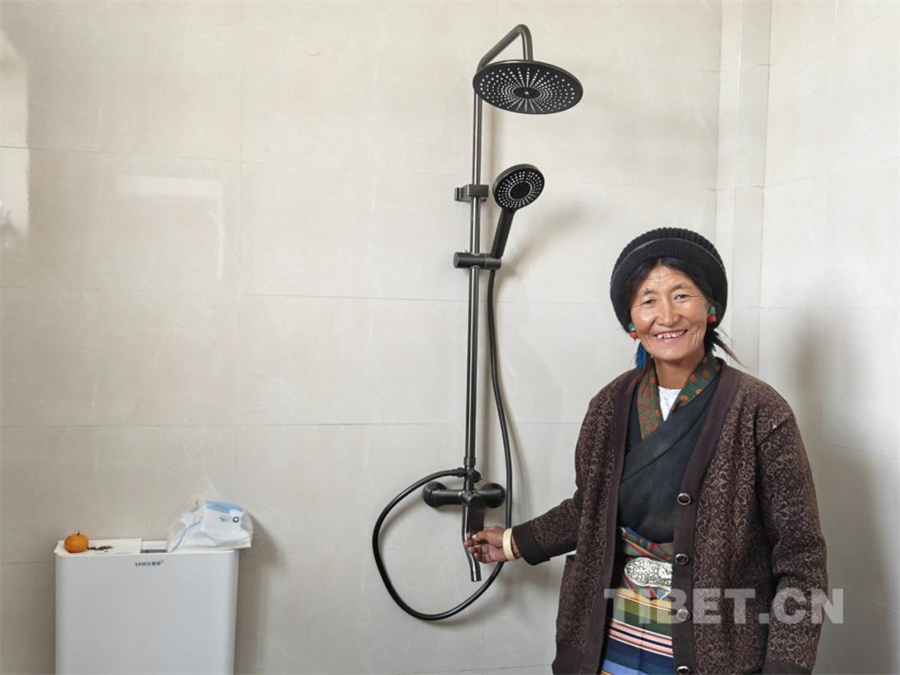 图为日喀则市拉孜县拉孜镇措布村村民向记者展示自家新居内的淋浴设施,脸上洋溢着幸福的笑容(摄于2025年10月30日) 摄影:次旦拉姆